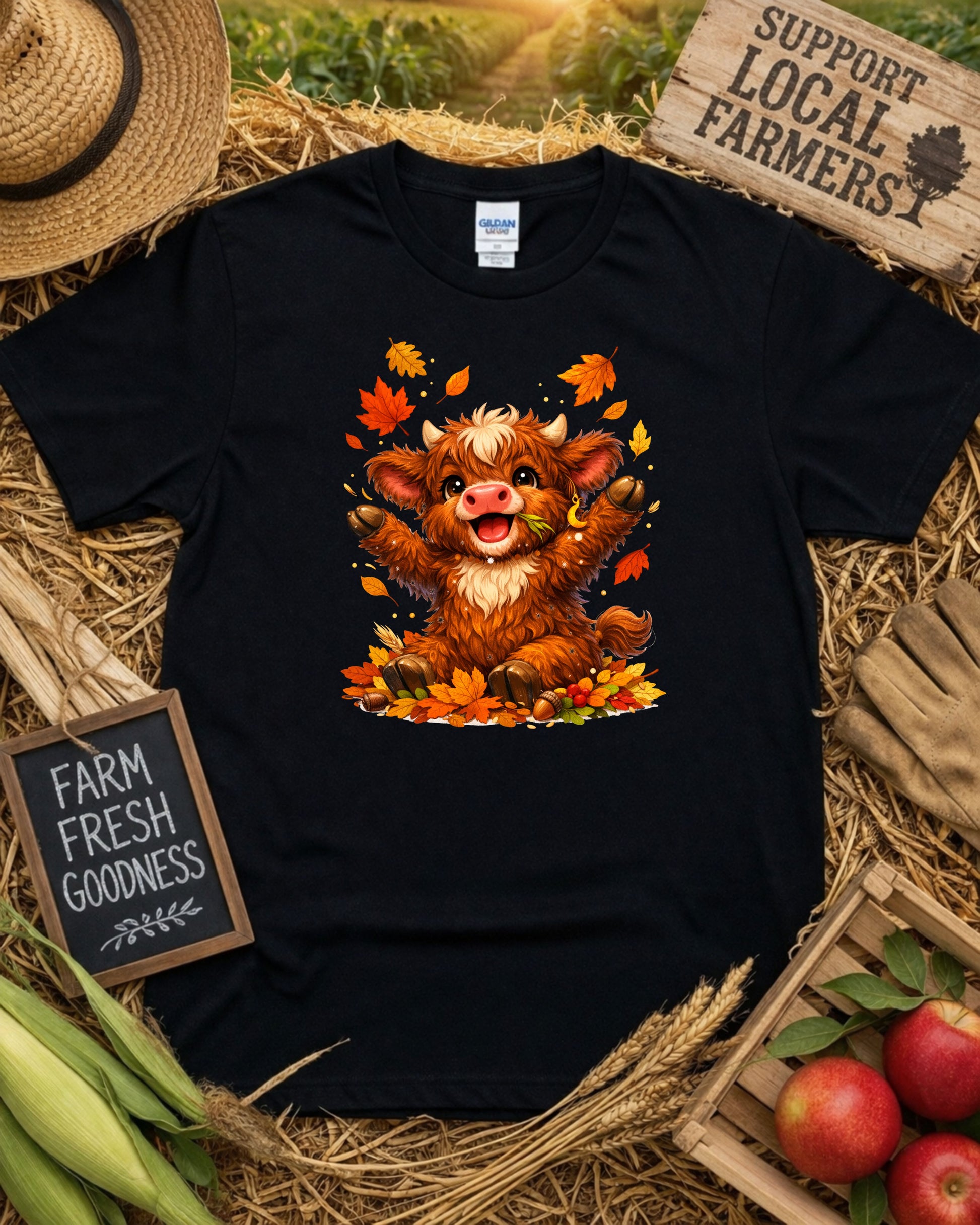 Autumn Highland Cow Clipart – Cute Fall Cow PNG, Kawaii Baby Cow Illustration, Rustic Fall Leaves Animal Art for Sublimation & Kids Decor