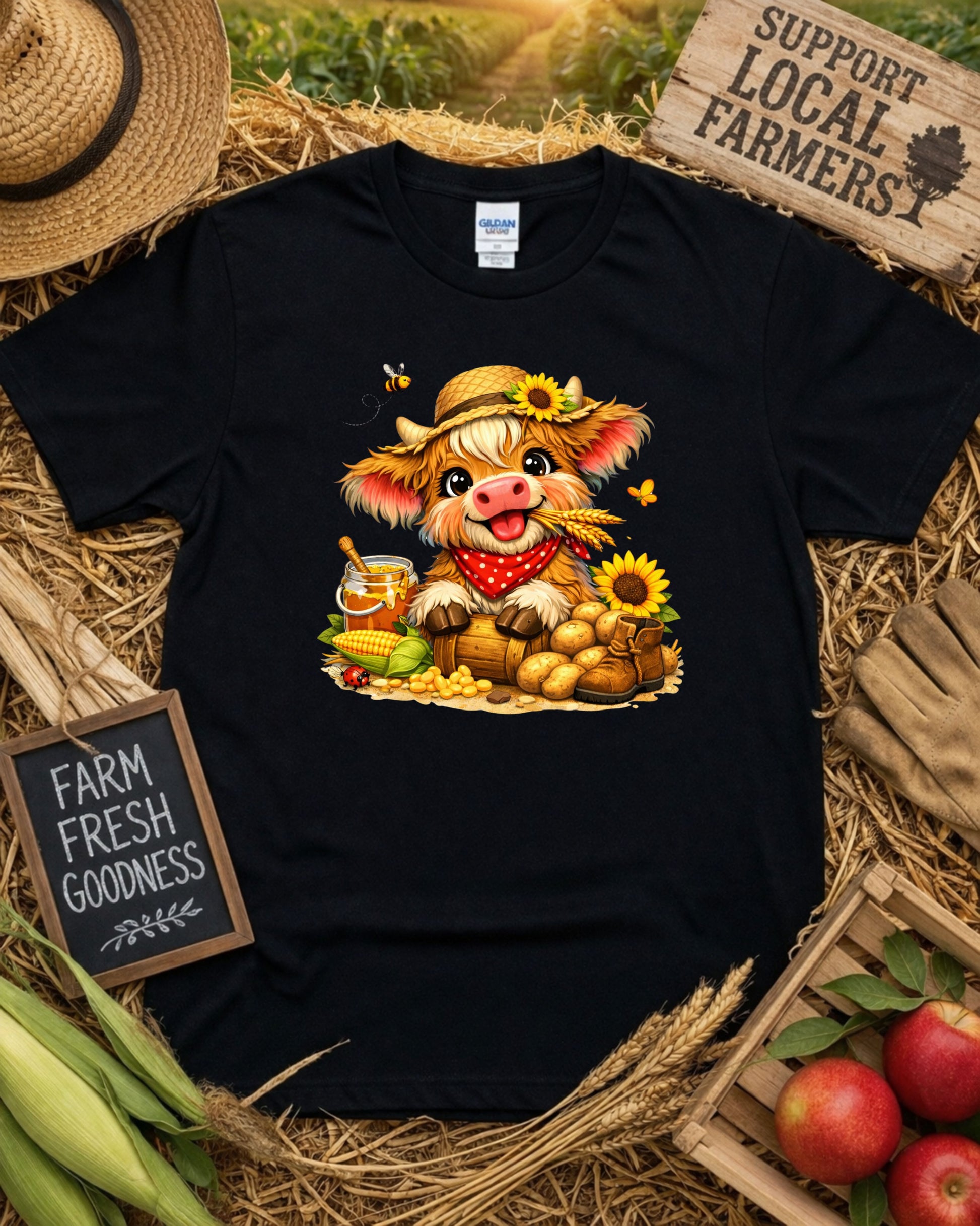 Bring warm country charm to your designs with this adorable farmhouse‑themed baby cow clipart, featuring a fluffy calf wearing a straw hat with a sunflower, a red polka‑dot bandana, and surrounded by cozy farm elements like honey, corn, boots, potatoes, and cheerful little critters. This sweet, rustic illustration is perfect for sublimation projects, farmhouse kitchen decor, kids’ room art, stickers, mugs, apparel, planners, invitations, and country‑themed crafts.